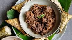 Verhit nog wat olie in de pan en fruit hier de boemboe in aan tot deze geurig is, ca. 2 minuten. Wel goed blijven roeren zodat het niet aanbrandt. Doe het vlees terug in de pan en voeg kokosmelk toe, samen met net zo veel water tot het vlees onder staat. Leg een knoop in de serehstengel en voeg deze toe aan de pan, samen met de kaneelstokjes, djeruk purut en tamarinde. Breng op smaak met zout, niet te veel, je kunt dit later altijd nog meer toevoegen. Breng het mengsel aan de kook en draai het vuur lager zodat het zachtjes pruttelt. Laat de rendang nu ca. 2-3 uur zonder deksel opstaan, tot het helemaal is drooggekookt. Als het te snel droog kookt kun je wat water toevoegen, zodat het niet aanbakt. En natuurlijk af en toe roeren.